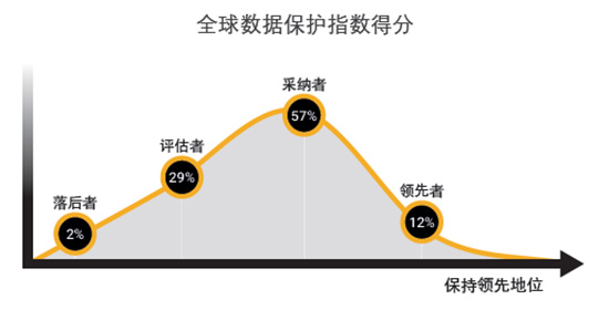 尽管被归类为数据保护“采纳者”的人数增加了近50个百分点(从2016年的9%上升至2018年的57%),而“领先者”也增加了10个百分点(从2016年的2%上升至2018年的12%),但大多数企业都在努力实施能够充分满足其需求的解决方案。