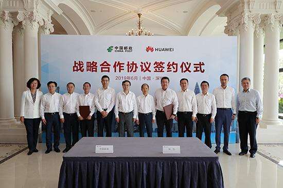 中国邮政董事长刘爱力(左六)与华为轮值董事长徐直军(右六)出席签约仪式