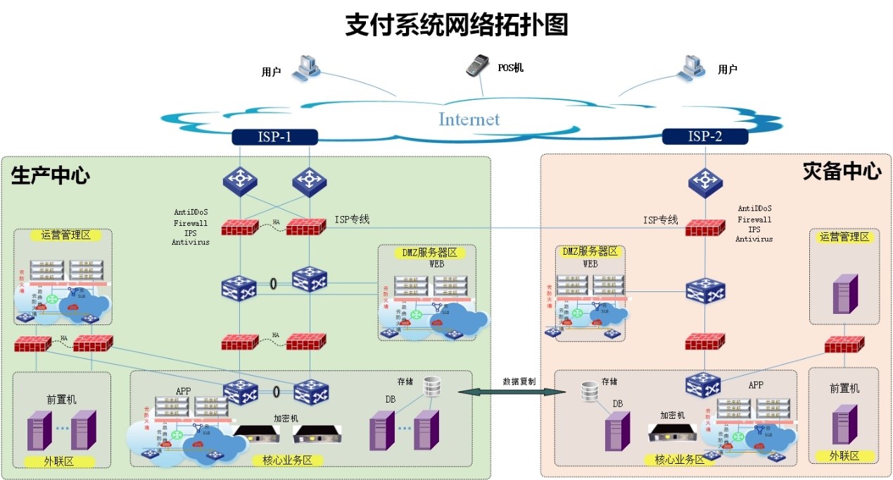 本次项目主要是建设形态为托管云,整体部署结构分为生产中心和灾备中心,其中生产中心采用全冗余设计,核心数据库采用物理集群部署方式,运营管理区域、DMZ区域通过云平台进行区域化管理,不同区域边界采用防火墙进行细化访问控制。灾备中心全部单节点部署配置,与生产中心进行业务状态同步、数据同步,以实现极端情况下,终端用户仍可通过备用链路进行业务访问。