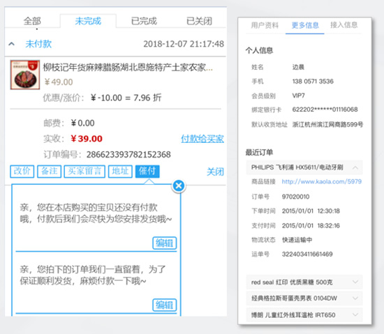 前端面向的是消费者体验、后端面向的是坐席服务效率。为此,七鱼为客户进行了最大限度的信息整合和业务融合,帮助电商企业提升服务响应效率。譬如,七鱼将客户的多系统整合到统一的坐席工作台,基于客服实际工作需求,在一个界面里展现更多更有效的信息,使得服务记录及用户标签画像等重要信息一目了然。订单、商品、物流等信息也支持一键查看。此外,在对话界面,历史会话支持永久保存同步。上述服务信息的集成有效解决了长期困扰客服的信息不对称等问题,可极大的提升服务效率和用户体验。