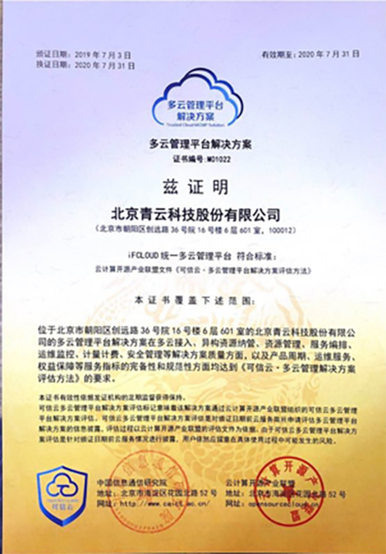 此次通过可信云认证,标志着iFCLOUD统一多云管理平台安全和质量获得专业认可,各项服务指标完备且规范,在多云接入、异构资源纳管、资源管理、服务编排、运维监控、计量计费、安全管理等解决方案质量方面,以及产品周期、运维服务、权益保障等服务指标的完备性和规范性均达到可信云多云管理平台认证标准,切实帮助企业在提升 IT 服务交付效率、增加资源利用率的同时降低运维成本,加速业务创新。