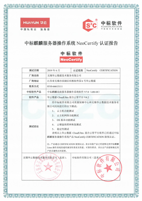 其中,华云数据混合云管平台CloudUltra?与中标麒麟服务器操作系统产品NeoCertify CERTIFICATION已经完成兼容性相互认证。双方通过共同进行云主机功能测试、云主机网络功能测试、OS基本功能测试、云硬盘快照和恢复测试、稳定性测试,达到互相产品的通用兼容性要求及性能、可靠性要求,能够满足用户的关键性应用需要。