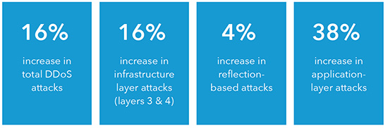 在游戏全球化的大背景下,越来越多的中国游戏企业也踏上远征之路,扬帆“出海”。Akamai观察到,中国游戏出海企业同样饱受安全问题困扰,不得不面对素来凶险的网络环境。从2017年到2018年,Akamai监测到的DDoS攻击和基础架构层(第三、第四层)攻击数量均上升16%,而应用层攻击的增幅更是高达38%(见图一)。