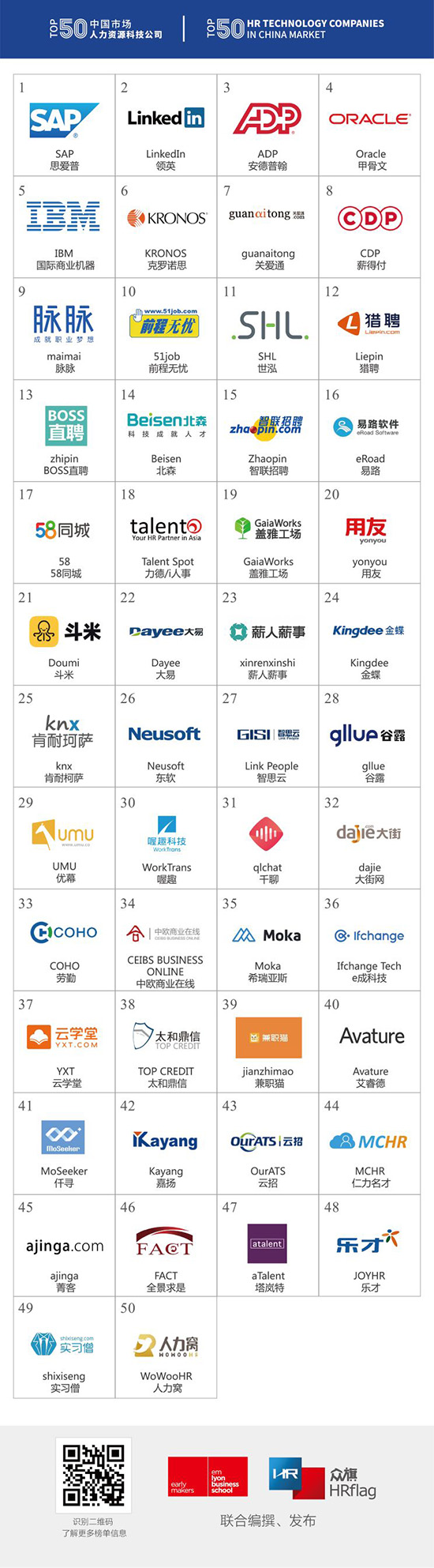 日前, SAP荣登 “中国市场人力资源科技公司50强”榜单首位。该榜单充分表明,全球领先的云端人力资源管理解决方案SAP SuccessFactors(HR云)在中国已经获得了业界与客户的广泛认可和高度支持。此外,SAP还在一同发布的“中国人力资源科技公司(人力资源软件方向)”排名中位列第一。