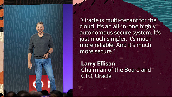 作为甲骨文的一号人物,甲骨文公司董事长兼首席技术官拉里·埃里森(Larry Ellison)在大会现场发表了主题演讲,揭秘了全新发布的重磅产品和部署升级,同时对甲骨文的企业动向和未来趋势做了重要说明。