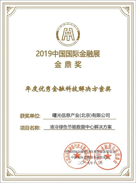 2020年1月9日,2019中国国际金融展“金鼎奖”获奖名单公布。曙光凭借为中国建设银行总行武汉南湖数据中心(以下简称“南湖中心”)建设的“液冷绿色节能数据中心”,获得2019年度优秀金融科技解决方案“金鼎奖”。