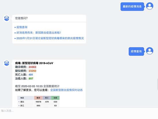 在用户进入咨询页面后,平台即可主动提供“热门话题”的便捷索引,直接点击关键词便可跳转到用户关心的话题。例如点击“返回小区”,即可获知不同城市对于外来人员返回小区的相关政策,便于居民更好地安排返程,避免一次一次改签。而当用户输入“疫情消息”、“新闻”、“我要捐物资”等词或短语时,机器人能快速抓取关键词进行意图识别,判断用户问题后进行答案回复和相关热点答案推送,接下来用户可通过直接点选的方式,无需打字,与在线机器人完成多轮会话,获取答案。