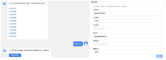 针对于人员健康状况/返程报告、患者自助上报、求助,或是物资求助、捐赠等场景,最重要的就是在用户填写完整信息之后通过接口上传到相关系统进行准确及时处理,且避免人员接触。近日,民政部也发布最新消息,呼吁社区取消传统登记方式,改为线上实施录入,最大限度避免近距离接触和产生交叉感染的风险。网易七鱼疫情服务机器人可以帮助社区物业轻松实现。用户进入咨询平台,点击“体温上报”或是“人员报备”、“患者求助”之后,后台会自动弹出表单,居民/患者完整填写信息并上传至相关系统,这个功能可以加快防疫机构和社区的信息收集速度,对决策相应措施提供强有力支持。