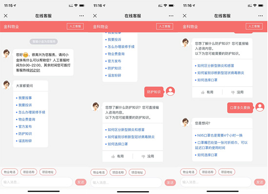 七鱼疫情服务机器人一经上线,便收到多家物业公司的咨询。以金科物业为例,作为中国知名物业服务商之一,其服务已覆盖全国135个城市,130万家庭,并与业主之间搭建了良好、有效的沟通渠道。疫情期间,金科服务紧急启动疫情防控应急预案,在第一时间成立了由物业客服管家、环境专员、秩序管理专员组成的工作小组,保障500万业的环境安全。同时,金科物业APP和小程序急速响应防疫需要,上线了网易七鱼疫情服务机器人,为业主提供包含“官方发布”、“防护知识”、“谣言粉碎”的疫情相关问题咨询通道,协助业主自查和自我防护。