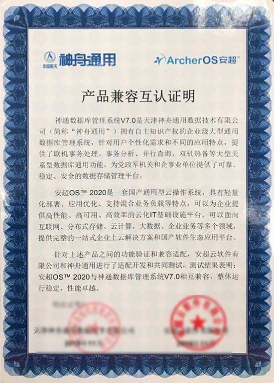 此次安超OS 2020与神通数据库管理系统V7.0完成适配后,安超OS 2020的用户可以安全、稳定、快速的使用神通数据库管理系统V7.0。而对于神通数据库管理系统V7.0的用户来说,能够确保其业务安全稳定的运行在云平台上。此次互认证对安全、保密要求较高的行业实现了双剑合璧的效果,能够满足用户更多关键性应用需要。