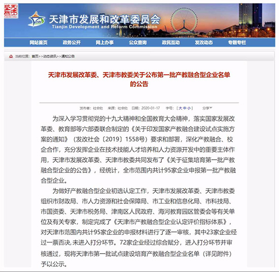 据悉,72家试点企业经过至少1年的建设培育期后,申报进入产教融合型企业认证目录,享受国家及天津市相关政策支持。