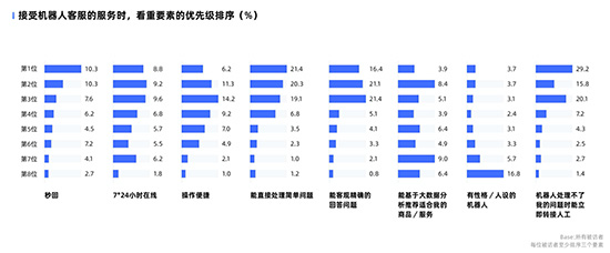 报告对消费者在接受机器人客服服务时所看重的要素进行了优先级排序, 其中机器人的服务灵活性和准确性最被看重。其中, “能直接处理一些简单问题(例如查快递信息,修改订单)”、“能客观准确的回答问题”、“机器人处理不了我的问题时能立即转接人工”三项占比最高 。