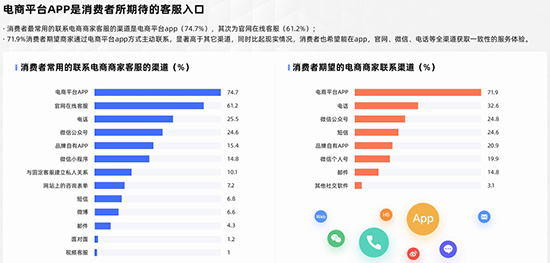 “随地”则体现了消费者对服务触达渠道的期望。本次调查涵盖了APP、网站、微信公众号、微信小程序等大部分新兴渠道,以及电话、短信、邮件等传统服务渠道,共涉及十几个渠道入口。调查显示,高度发达与便捷的移动互联网应用下,消费者更愿意通过新兴的移动端渠道获取服务,其中最常用的是电商平台APP(74.7%),其次为官网在线客服(61.2%)。同时,消费者也希望在APP,官网、微信、电话等全渠道获取一致性的服务体验。