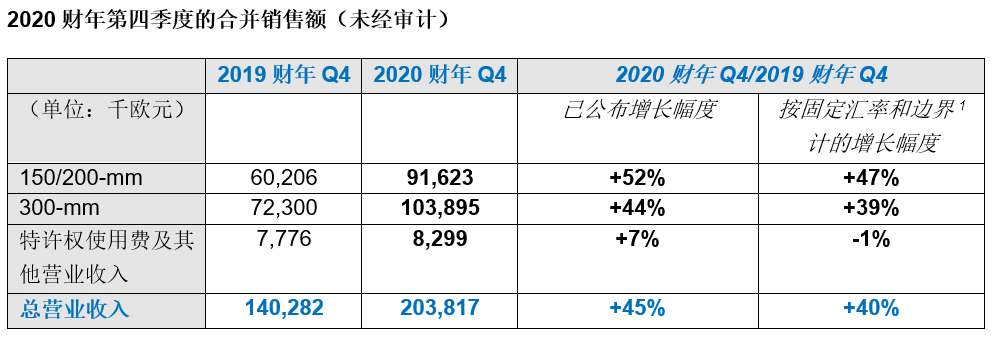 与2019财年相比,2020财年第四季度的销售额创历史新高,按固定汇率和边界2计,集团全年增长率高达28.3%。按固定汇率计,150/200-mm晶圆销售额较2019财年增长20%,而300-mm晶圆销售额增长了38%。两者销售额的增长均主要受到RF-SOI晶圆的销量推动。