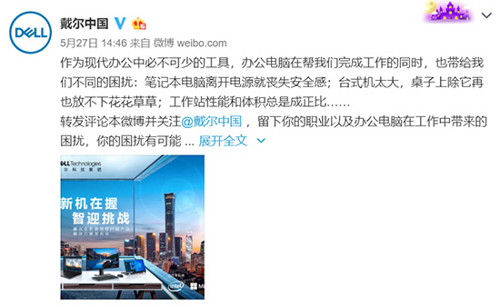 近期,戴尔也在微博发起关于职业及办公困扰的话题互动,关注戴尔科技,戴尔中国微博账号,进行分享,你的困扰就有机会被选中作为戴尔商用客户端线上发布会中创新办公大挑战项目。更有机会赢得智能办公大奖。