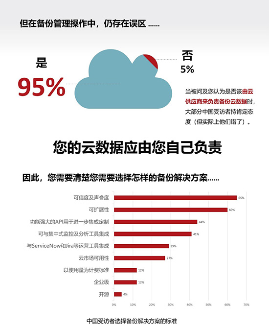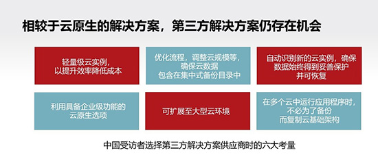 在调研中,近七成企业表示已有相关预算,准备在未来一年内购买新的云数据保护解决方案。此外,大多数受访企业也表示,计划在未来三年内大幅增加用于备份和恢复方面的预算。在兼顾本地和云工作负载的受访者中,有近半表示希望使用单一的备份解决方案,中国受访者的意愿在这一方面更为突出,数字比例达56%。
