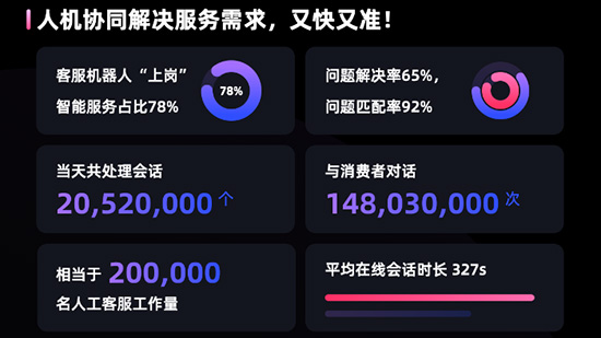 人机结合的智能化解决方案对于客服响应能力的提升是非常显著的。据统计,本次618期间,七鱼的人机协同机制在当天共处理了2052万个会话,与消费者对话14803万次,相当于20万名人工客服工作量,问题解决率65%,问题匹配率高达92%。