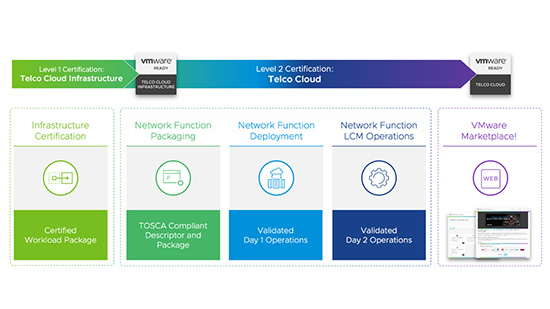 • VMware Ready for Telco Cloud:通过VMware Telco Cloud Automation多云编配和自动化平台,为网络功能的部署和生命周期运维提供认证。作为该认证计划的一部分,VMware与合作伙伴合作创建符合ETSI标准的描述符、以及面向经验证和测试的Cloud Service Archive(CSAR)的工作流、资源和组件。该认证要求合作伙伴必须先完成VMware Ready for Telco Cloud Infrastructure 认证。