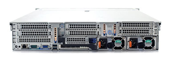 转到背面,我们可以很明显地看到有足够的空间来扩展插卡。右下角有两个电源供应器。底部中间有4个10G SFP+端口,左侧有两个USB 3.0端口、一个VGA端口、串行端口和一个1G RJ45 iDRAC端口。