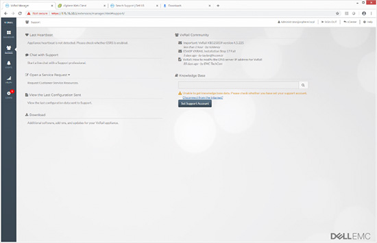 支持选项卡提供支持相关的功能。它会检查设备的最后“活动信号”,以确认是否有问题。它提供多种支持选项,包括聊天、提交服务请求、查看最后传送配置、下载软件(例如,升级套件),并让用户查看VxRail社区动态。这里还提供知识库搜索栏,方便用户查找特定问题。
