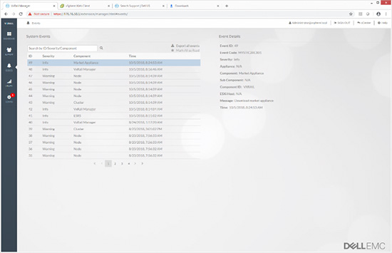 设备部署完成之后,管理员将进入VxRail Manager主画面。系统将自动转到仪表板,其中会显示系统整体运行状态、支持、VxRail社区和事件历史等信息。左边是若干个选项卡,其中包括:仪表板、支持、事件、运行状态和配置。