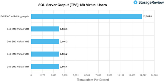 在我们的交易型SQL Server性能评定中,Dell EMC VxRail P570F总分达到了12,585 TPS,单个虚拟机得分从3,145.1 TPS到3,148.5 TPS不等。