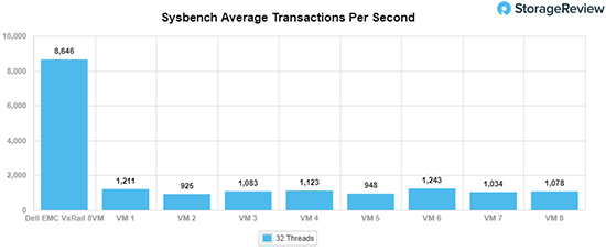利用Sysbench OLTP,我们可以看到8个虚拟机中每个虚拟机的配置。VxRail总分为8,645.9 TPS,单个虚拟机得分从925.48 TPS至1,243.1 TPS不等。