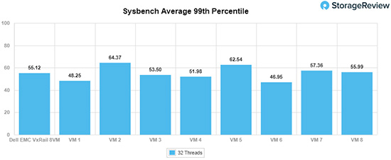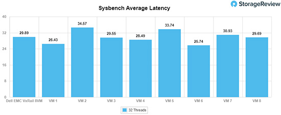 在Sysbench平均延迟方面,VxRail总分为29.9ms,单个虚拟机延迟在25.7ms至34.6ms不等。