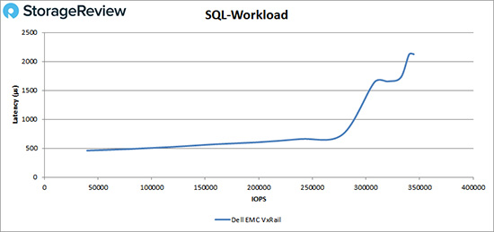 在接下来的SQL工作负载测试中,Dell EMC VxRail P570F在大约285,000 IOPS以内都保持亚毫秒级延迟性能,峰值为344,619 IOPS,期间延迟为2.1ms。