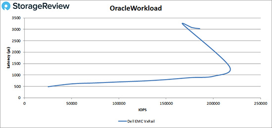 在Oracle 80-20工作负载测试中,VxRail在226,000 IOPS之前都拥有亚毫秒延迟性能,随后达到性能峰值,约为258,000 IOPS,延迟为1.76ms。