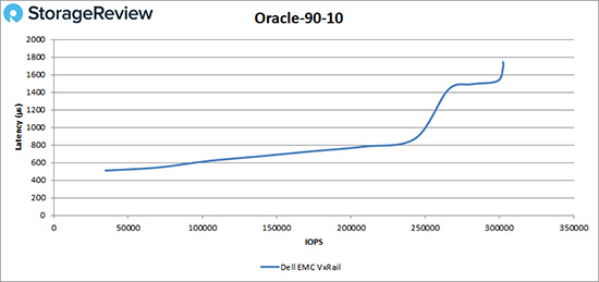 在Oracle 90-10工作负载测试中,VxRail在250,000 IOPS以内都保持低于1ms的延迟性能,性能峰值为302,381 IOPS,期间延迟为1.7ms。