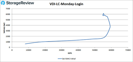 在VDI完整克隆周一登入测试中,VxRail在性能达到20,000 IOPS之前都维持亚毫秒延迟,然后达到性能峰值,大约为93,000 IOPS,在性能稍微下降之前延迟为3.1ms。