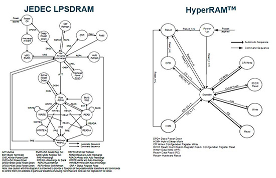 HyperRAMTM 系以 PSRAM 架构为基础,是能够自刷新(Self Refresh)的 RAM。而且,它可以自动恢复为待机模式。因此,系统内存更易于使用,固件和驱动程序的开发也会更简单。
