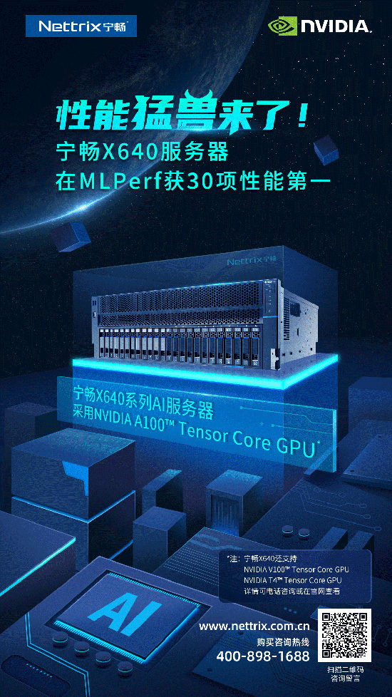 如今通过提供定制化服务,宁畅AI服务器已广泛应用于知名互联网、云计算公司,支撑语义识别、图像分析、机器翻译、训练推理等AI场景。在2020年10月,AI基准性能评测平台MLPerf官网显示,搭载NVIDIA T4 /A100 GPU的宁畅X640 G30 AI服务器,在ResNet、BERT、DLRM等基准测试中更是取得30项性能第一。