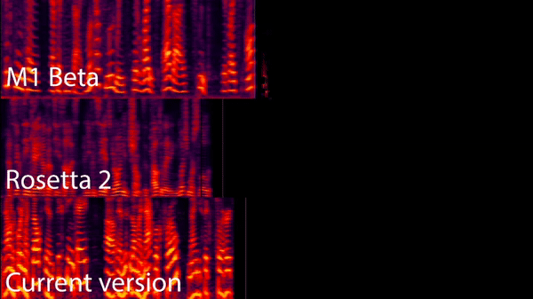 如图所示为在M1 Beta版、Rosetta 2、以及当前版本Audition中16K FFT的频谱实时渲染效果。频谱率显示编辑器提供了音频和Photoshop样式的可视化表现形式,可供用户用于精确编辑。