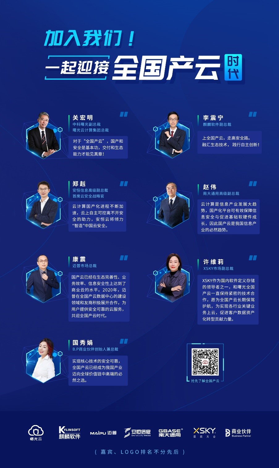 本次活动中,各公司将全国产云与自身业务优势结合,分别发布了不同主题的倡议海报。安恒信息带来了“携手护航,安全未来”的主题海报并表明愿携手生态伙伴为云计算产业保驾护航。南大通用作为数据库领域知名企业,倡导“数据启智,共绘锦绣”。英方软件作为专注于容灾及业务高可用领域的领导者,从灾备角度发布“聚力国产,云上灾备”的主题海报。深圳震有科技则在应用层面强调“云端调度,智慧应急”。此外,青云QingCloud、东方通、中科方德等20余家业内知名公司、联盟联合发布了主题海报,呼唤“全国产云”时代的到来。