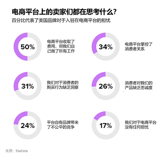 但不利的一面也逐渐显露出来。随着每个品牌都在争取露出机会,电商平台逐渐变为红海市场。同时,越来越多的问题累积也逐渐突破品牌的忍耐极限,比如:对客户关系主动权的丧失;层出不穷的新规则和处罚;微薄的利润;入驻商家彼此之间或与平台自有品牌之间的激烈竞争,有时甚至是肮脏的竞争。
