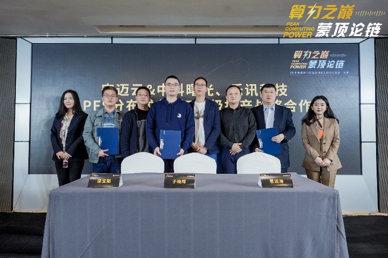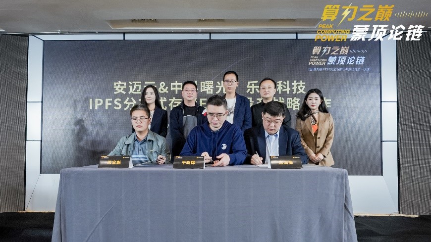 3月29日,在“算力之巅 蒙顶论链”暨雅典娜云池算力全球第一庆典上,曙光信息产业股份有限公司(以下简称:中科曙光)、海南安迈云网络技术有限公司(以下简称:安迈云)与北京乐讯科技有限公司(以下简称:乐讯科技)共同签署了“IPFS分布式存储EB级投产”战略合作协议。中科曙光存储公司总裁惠润海、安迈云首席战略官于晓晖、北京乐讯科技有限公司联合创始人梁宝魁,分别作为代表出席了本次签约仪式。三方宣布将在分布式存储技术、区块链应用、产业生态融合等多领域开展全面合作,旨在加快Web3.0智能时代数字经济领域的新型基础设施建设,共同推动“区块链存储生态”发展。