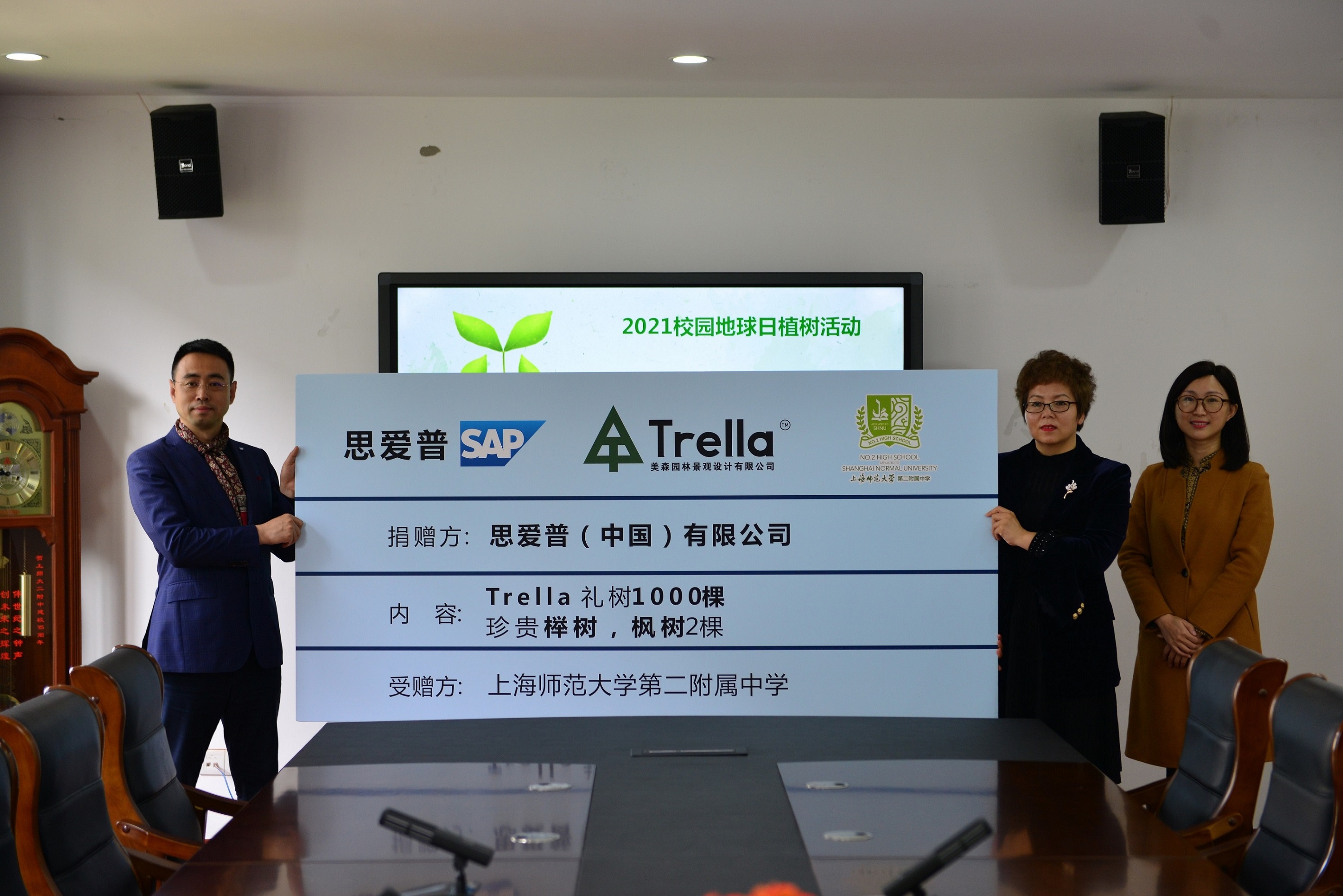 2021 年 4 月 22 日,上海讯 — 今年的世界地球日,SAP向上海师范大学第二附属中学捐赠了1000余棵中国本土珍贵树木,以践行公司 “2025年前在全球种植500万棵树木” 的承诺。SAP携手在中国管理着百万树超级中心和多个植树造林项目的Trella森林科技(以下简称 “Trella” ),在上海师范大学第二附属中学举行了本次捐赠和植树仪式。SAP全球副总裁、SAP中国联席总经理董志刚,上海师范大学第二附属中学校长蔡文,以及Trella 中国区总经理李若薇共同出席了千树捐赠仪式,并围绕世界地球日这一主题,对一千多名在校学生进行了环境教育。