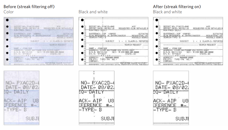 更进一步的图像处理,柯达S3100f会去除扫描后图像的各种条纹、减少纸面上的脏点,甚至为了读取的需求而褪色处理,去除所有颜色,只保留黑色。并且前文所说的单面双传感器,还能实现双流处理:同一份文档,一次扫描,即可同时输出黑白、彩色、灰度文件中任意两种类型的图像。对于文档本身质量不高,在进行OCR识别之前,软件还能进行智能阈值处理,智能的分析前景的文字图像和背景,并处理掉背景。