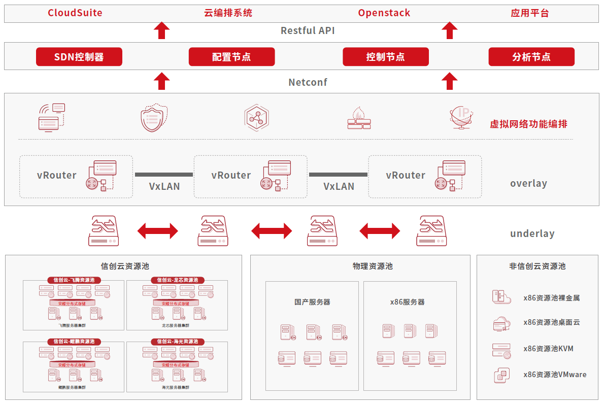SDN方案核心是网络节点的集中控制能力。在通用的API与协议之下,ArSDN在单一界面便能实现众多差异化的物理及虚拟服务器的网络统一管理,使得运维人员的生活更加轻松。在Vmware与KVM大量共存的环境下,ArSDN不仅可以实现异构网络通信,更可以充分利用物理服务器、虚拟机和裸金属的资源,实现流量的灵活分配调度,提高了配置管理效率。