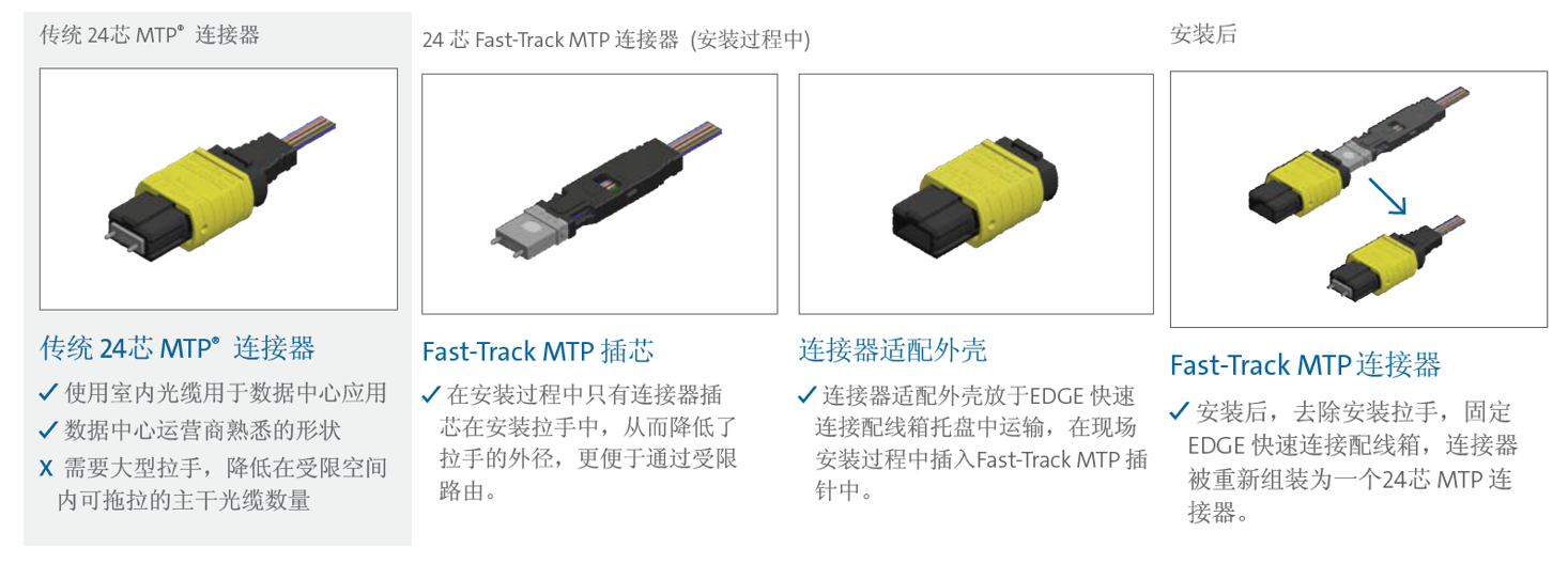 在室外环境中,由于安装拉手太大无法让足够的光纤通过现有的管道,直到现在安装预连接的主干光缆都非常困难。但是通过使用一个更小的 5cm 直径安装拉手,EDGE 快速连接解决方案使更多的预连接光纤通过单个管道,为数据中心运营商提供了一条通往超高密度的新路径。