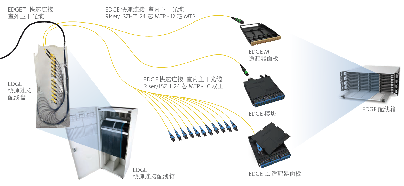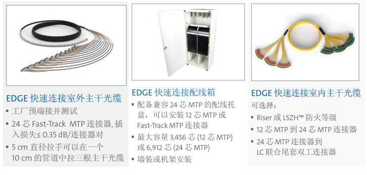 EDGE快速连接解决方案提供带 Fast-Track MTP 连接器的室外主干光缆、室内主干光缆和EDGE快速连接配线箱,配合已广泛部署并屡获殊荣的EDGE解决方案产品,EDGE快速连接解决方案可以满足数据中心内部和数据中心之间高芯数布线的部署需求。