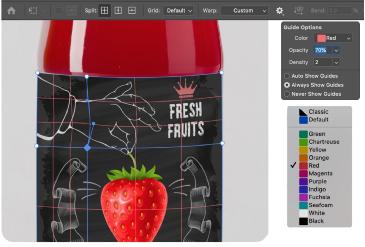设计师现在可以通过移动独立的贝塞尔曲线手柄控制变换扭曲的程度。借助这一优化过的键盘快捷控件,包装设计师等需要在瓶身、外盒和其他表面上进行拉伸和扭曲图像的创作者,可以调整边缘和拆分变形点,实现以往无法达到的变形效果。
