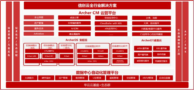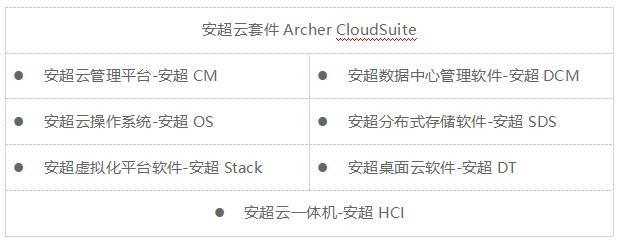 安超云基座一站式解决方案是由安超云套件系列产品Archer CloudSuite共同构成,同时组件可拆,每个组件均可独立服务,方案可以兼容不同x86、ARM、自主创新芯片的硬件与操作系统,适应不同阶段IT云化服务。并在集团信创基地群的生态做以大量兼容、稳定性适配,屏蔽底层基础设施差异,能为客户适配提供完整信创云方案。其中组件包括: