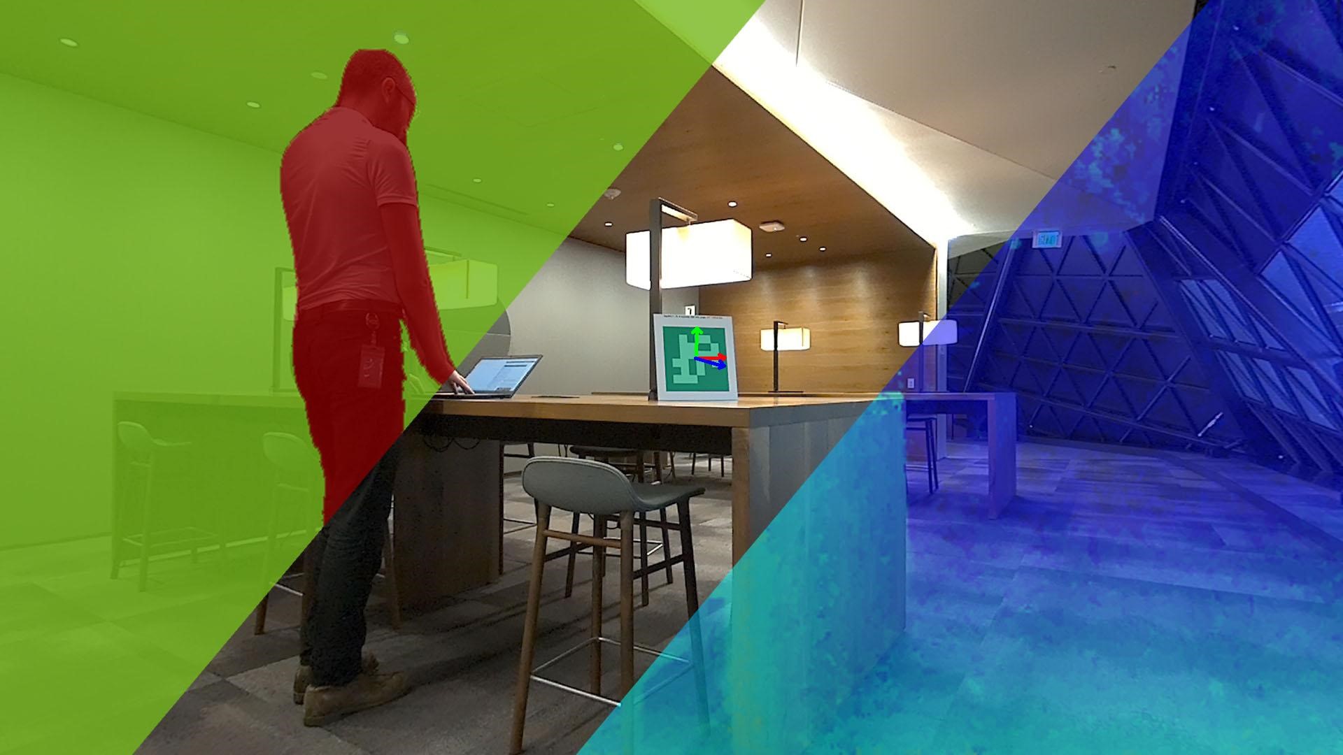 图2. 来自3个Isaac ROS GEM的合成图像 - DNN(PeopleSemSegnet)/AprilTags/Disparity(Depth)。