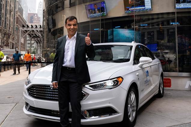 在Mobileye于纳斯达克证券交易所举办活动期间,Amnon Shashua教授站在Mobileye的自动驾驶汽车前