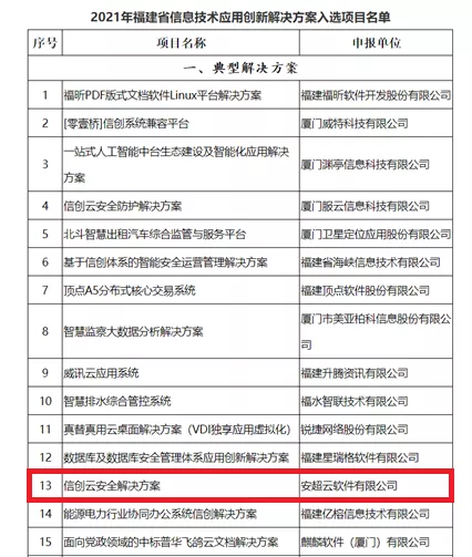 近日,福建省数字福建建设领导小组办公室公布2021年福建省信息技术应用创新解决方案入选项目名单,安超云软件有限公司(以下简称“安超云”)作为中国自主创新能力顶流的科技企业,凭借技术实力及市场开拓能力成功入围解决方案名单,成为信创领域科技创新典范。