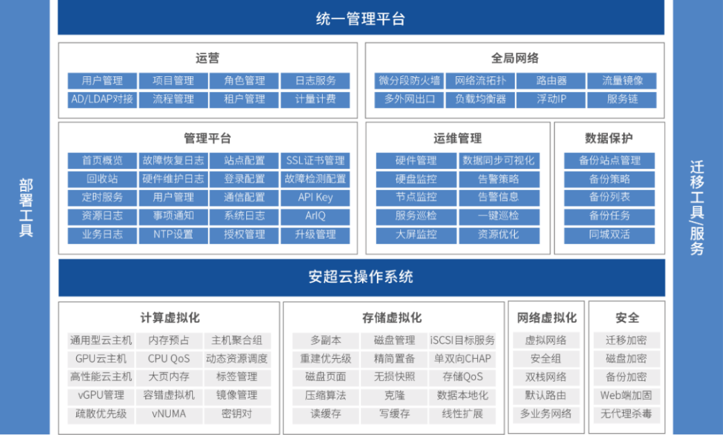 安超云操作系统包含操作系统、计算虚拟化、存储虚拟化、云管平台、云工作负载的迁移与自动化部署、应用商店等全栈功能,具有无厂商锁定特性,支持国内外主流品牌服务器,同时适配大多数芯片、操作系统和中间件。安超云操作系统的出现,填补了国内软硬件资源统一管理和调度的空白,能够为用户提供完整的一站式上云的平台和生态解决方案,帮助用户智能、快速、稳定地走向云端。