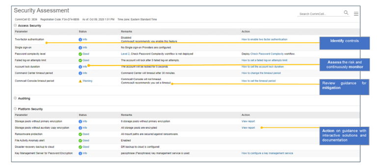 此外,当任何锁、警报和控制措施未被应用或被禁用时,安全健康评估仪表盘就会进行持续监控。其中包括Commvault可能会在未来提供并推荐用户使用的任何新功能集。